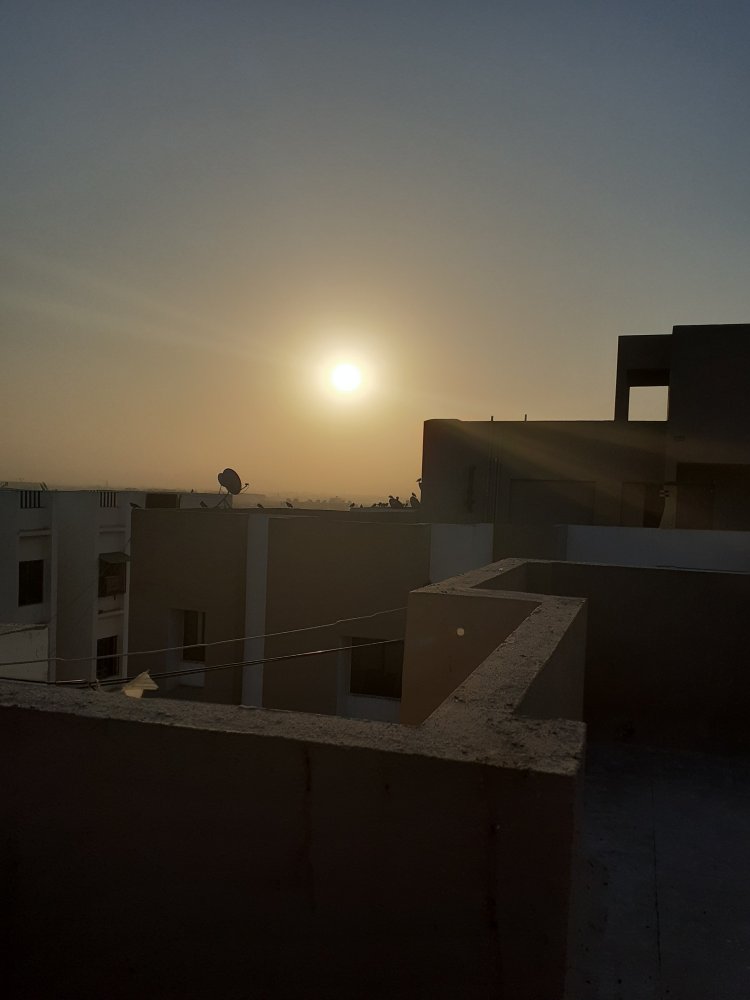 વાત મારે એ કરવી છે કે, હવે સમય એવો આવી ગયો કે ઉંચા ઉંચા બિલ્ડીંગ માં લોક વસવાટ કરે છે. સવાર તો હવે મોબાઈલ ના એલાર્મ ક્લોક થીજ થાય છે. દુધવાળો આવે ને પેપર વાળો આવે.બસ આ જ સવાર પડી છે એની અનુભૂતિ થાય.આજે સવારે કામ માં વ્યસ્ત હતી પણ સમય મળતા જ બાલકની માંથી બહાર જોયું. સાત ને વીસ થયી હતી. ઘણા બધા લાંબા સમય પછી સુરજ ને ઉગતા જોયો.